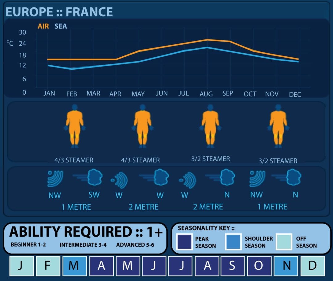 From rocky point breaks on the Brittany coast, world class beach breaks on the Bay of Biscay to big wave reefs down in the Basque Country, France has enough waves and swell to keep everyone entertained. Not to mention it boasts the longest beach in Europe and the warmest water of the whole of Atlantic Europe. And we haven’t even mentioned the wine, the food or the culture.