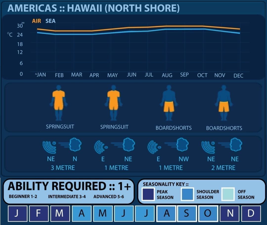 Located smack bang in the middle of the North Pacific Ocean the North Shore of Oahu is wide open to the powerful winter west and north swells. The best time to visit the North Shore is between October and March. November and December are however the most crowded months as hundreds of professional surfers decamp to “The Rock” from all over the world. February, March and October is better for holidaying surfers just looking to surf without the the contests and crowds. The Southern Shore of Oahu also gets its fair share of fun mostly In the summer surf months from May through August when the waves around Waikiki or “Town” come to life.