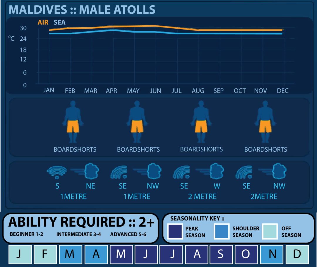 The most consistent swells for the Male Atolls occur between April and October. This is when the best south swells and prevailing west or southwest winds light up most of the quality breaks in the atolls to the north and south of Male. March and November can be considered transition months, but also provide moments of magic without the crowds.