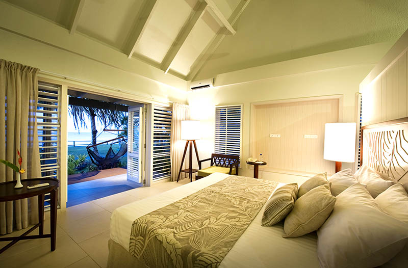Ideal for a romantic stay, our recently renovated Deluxe Bures are modern and well appointed. The Deluxe Bures have a king size bed with day bed, ensuite, as well as private outdoor showers and a perfectly positioned beachfront deck with hammock. INCLUSIONS: Room safe, wireless internet, fridge, ceiling fans, daily room service, air conditioned, alarm clock, tea/coffee making, hairdryer, iron. Breakfast inclusive.