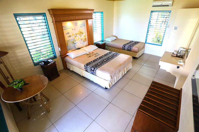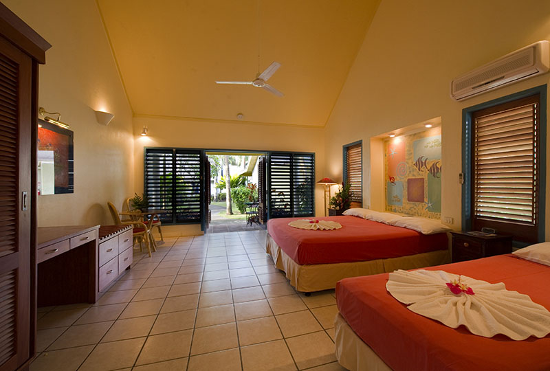 This Fijian style accommodation features a queen and single bed. This room also has an exclusively designed indoor and private outdoor bathroom. INCLUSIONS: Room safe, wireless internet, fridge, ceiling fans, daily room service, air conditioned, alarm clock, tea/coffee making, hairdryer, iron. Breakfast inclusive.