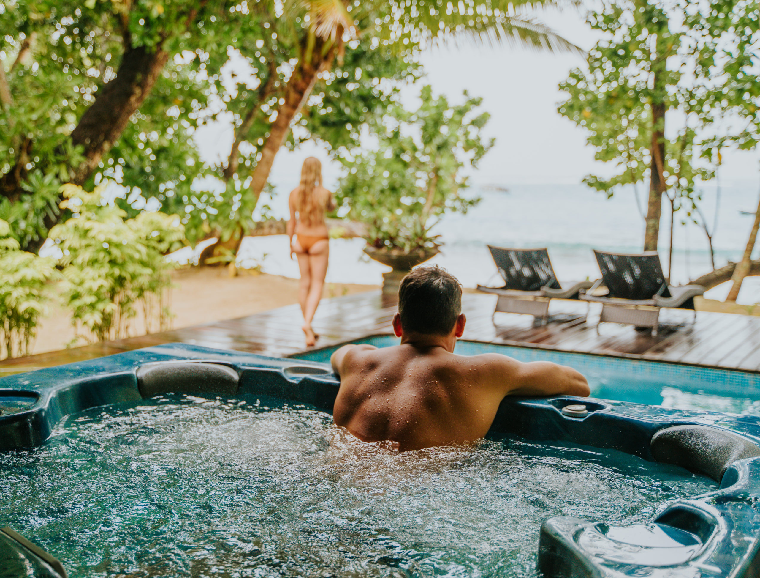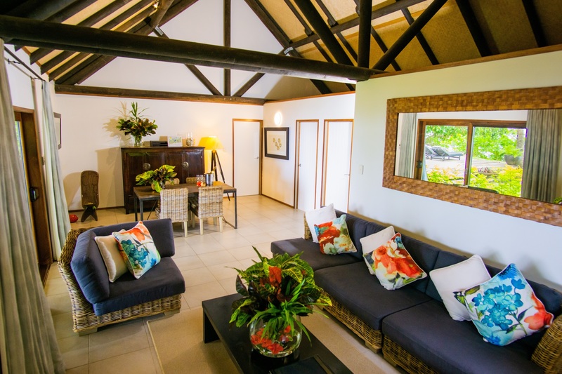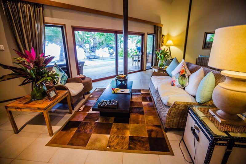 Royal Villa is 150 sq/mtr (1,700 sq/ft) luxurious beach house set at the end of the resort’s exquisite white sand beach, offering absolute privacy, and command outstanding ocean and beach views. They each have their own private plunge pool on an expanded sunning deck that goes to the edge of the beach. Also on the deck facing the views of the lagoon is a heated Jacuzzi spa and an outdoor rock wall shower. Inside the Royal Villa there is 2 full bathrooms; a master bedroom (king) with en suite (indoor shower), 2nd bedroom with 2 x single beds or 1 x king, a shared bathroom and a separate living/lounge area.
