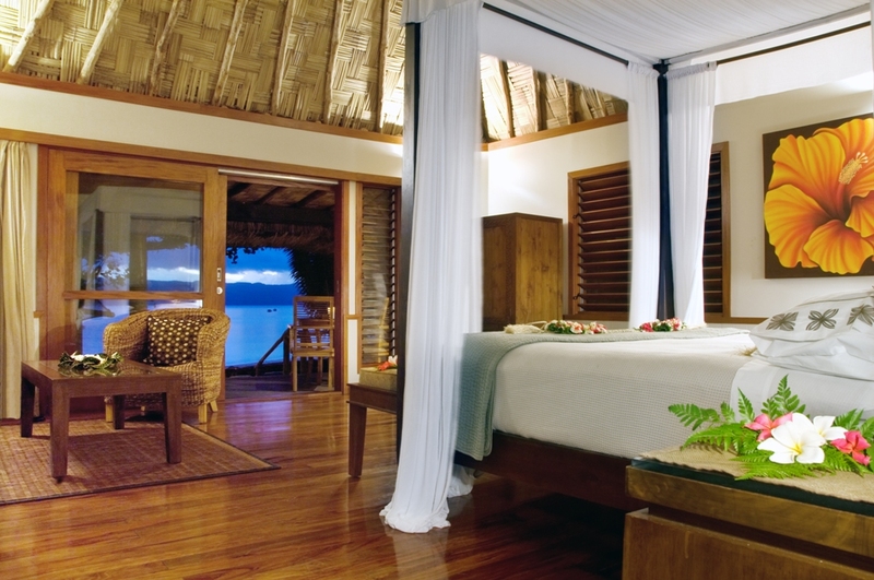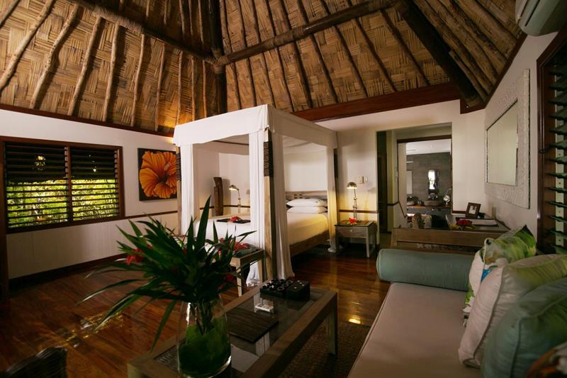 Beachfront Bures have each been designed in traditional Fijian style, with soaring ceilings, thatched roofs, hand polished Fijian mahogany hardwood floors, and feature local Fijian art. The king-size beds are draped with elegant and luxurious Egyptian cotton linens and the separate sitting area has comfortable furniture, along with a mini bar and coffee/tea making facilities. The bures all have ceiling fans and are fully air-conditioned. Room Size: 65 sq/mtr