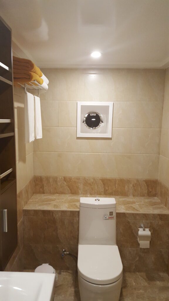 All cabins have individually controlled AC, safety deposit boxes, life jackets and TV screens connected to central media system and their own private bathrooms.