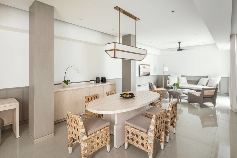90 sqm. Each of these spacious residences have a living room, kitchenette and master bedroom, with details that are elegant yet homely. They also feature private balconies from which to feel the Indian Ocean breeze.
