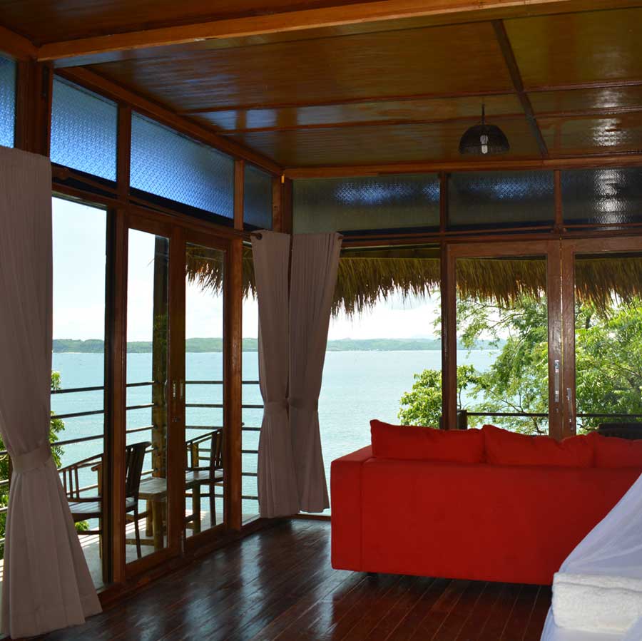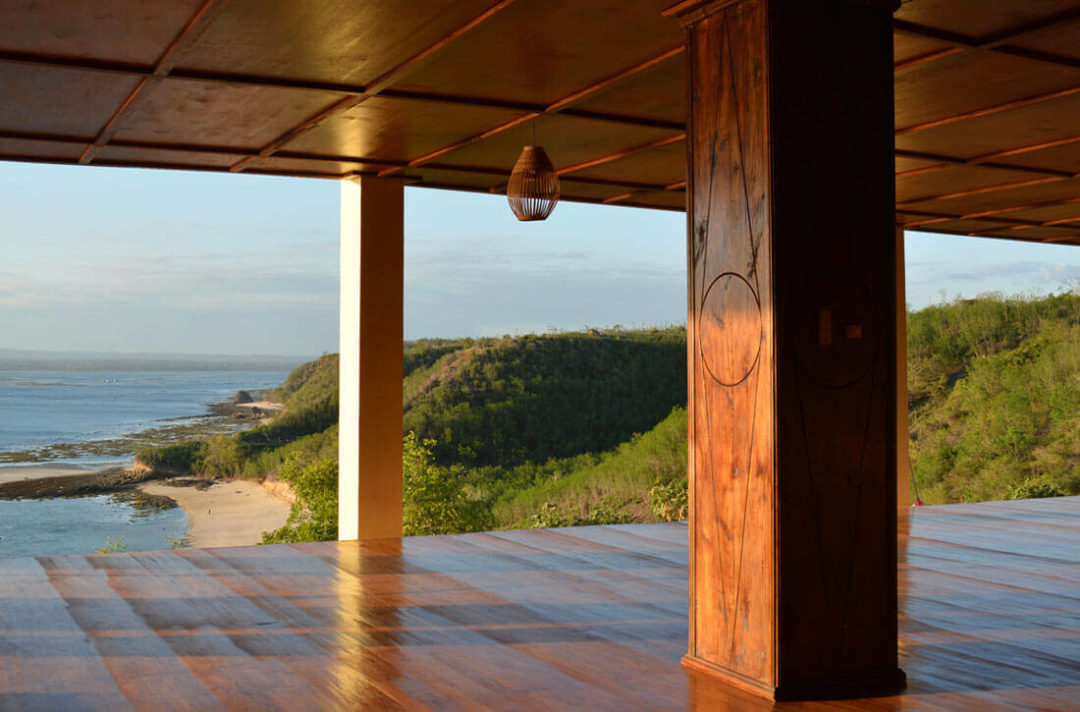 Surf View villas are all at the front, sitting 50 m above sea level, which makes the views amazing. All of them have a terrace, lie-down deck chairs and a full glass and timber front so you can wake up to the view or watch the lights of Ekas Bay from your bed.