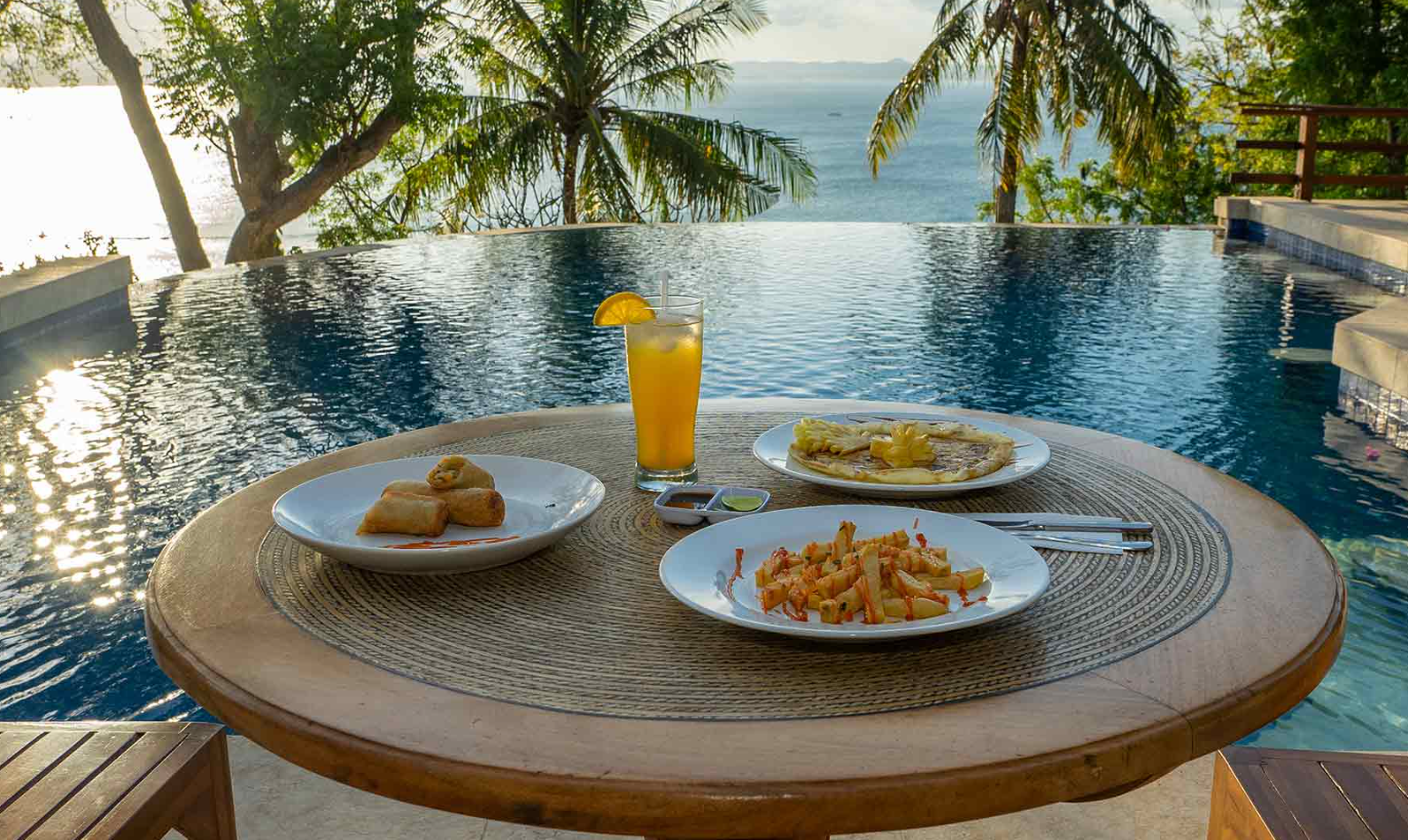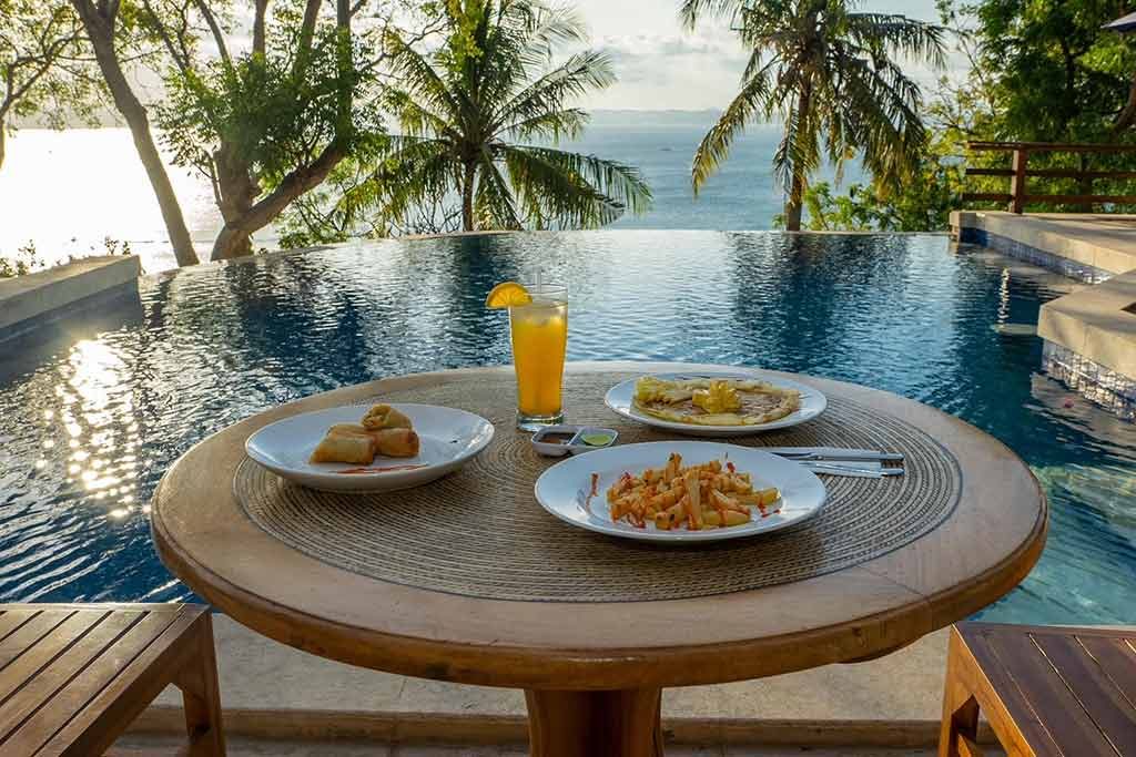 A cliff-top restaurant serving tasty food with amazing views. A brand new air-conditioned movie room with cinema seats so you can watch your favourite movies or watch big sports fixtures by satellite. Well-stocked bar – cocktails available. Business centre (air conditioned if required). If you have your own phone they can provide local SIM card or access to their own mobile phones. Internet and email can be unreliable, but SMS or text messaging is always available. Massage. Boat and vehicle.