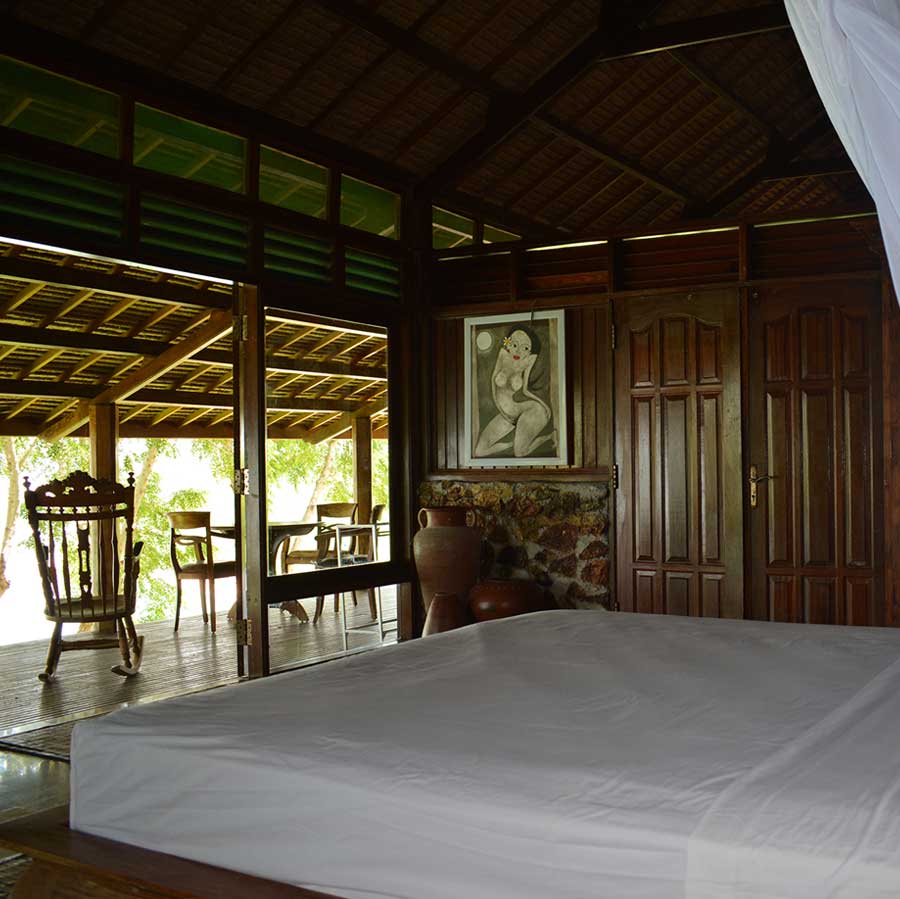 It’s only a 10-20 m walk to the views and all the rooms have some sea view through beautiful trees. You have full package rights, including all the equipment, surf boat, massages and the stunning restaurant with all meals included and infinity pool. Mahogany 1&2 are adjoining with the bathroom in between, accessed along the front terrace. They have a great relaxation area under the giant Bantan trees with your own table and chairs.