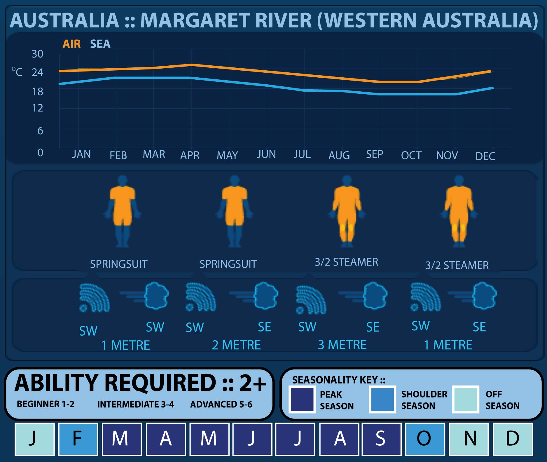 With so much coast, you can find waves in WA year round. The premier surfing region of the South West is usually at its best from late summer until early winter, when swells pulse and favourable easterly winds are common. The South Coast beach breaks are great in summer months as it picks up background swells and is offshore in the Northerly winds. Can stay good right through the year. The far North West is usually best surfed in winter months, however, winds can be strong although usually offshore. Winds ease from September to November.