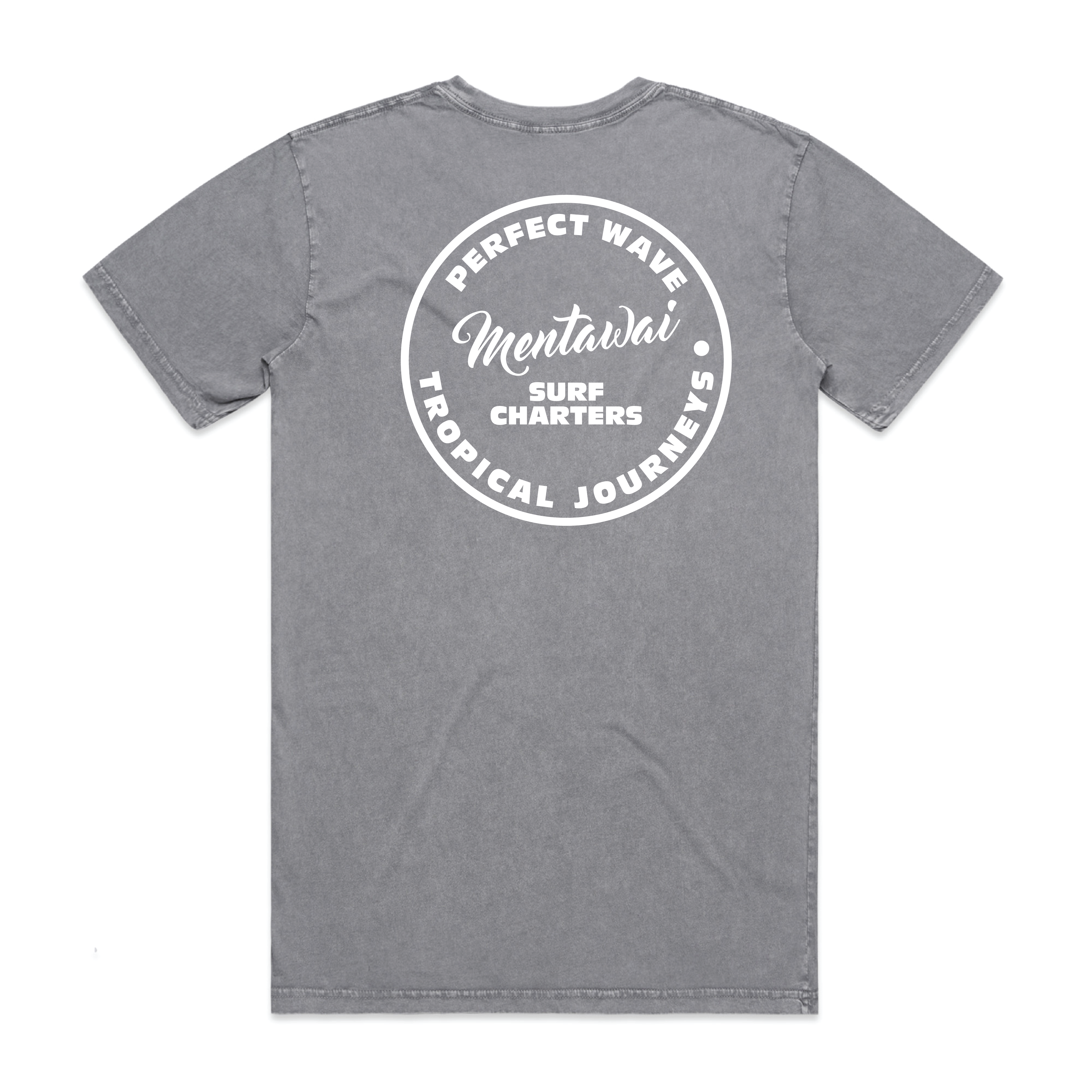 – Perfect Wave Mentawai tropical journeys circle logo on the back, and a smaller logo on the front.