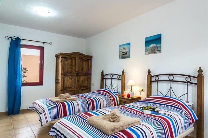 Surf House is a 4 Bedroom Villa situated in the quiet urbanisation of La Capellania just 3 KM outside of Corralejo. Around the corner you will find the local supermarket, an Italian restaurant and also a Spanish Cafe/Diner all within a few minutes walk. There is a bus stop and also a taxi stop within 2 minutes walk from the Surf House (Taxi costs approx. 9 Euros into town and the bus fare is approx. 2.5 Euros return per person). The House offers 2 Twin Rooms, a double room, and one room with a bunk bed and single bed. The rooms are divided over 2 floors with 2 rooms upstairs and 2 rooms downstairs. Each floor has it's own bathroom. The upstairs bedrooms offer Sea Views and one of them also has view of the Volcano and Lobos.