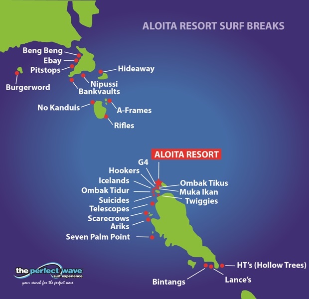 Breaks off of an island called Tugat Nusa just south of Telescopes. Great consistent left as exposed to South as well as SW swell. Best on a dropping high tide with the end section named the Curry bowl the pick of the wave for barrel riders.