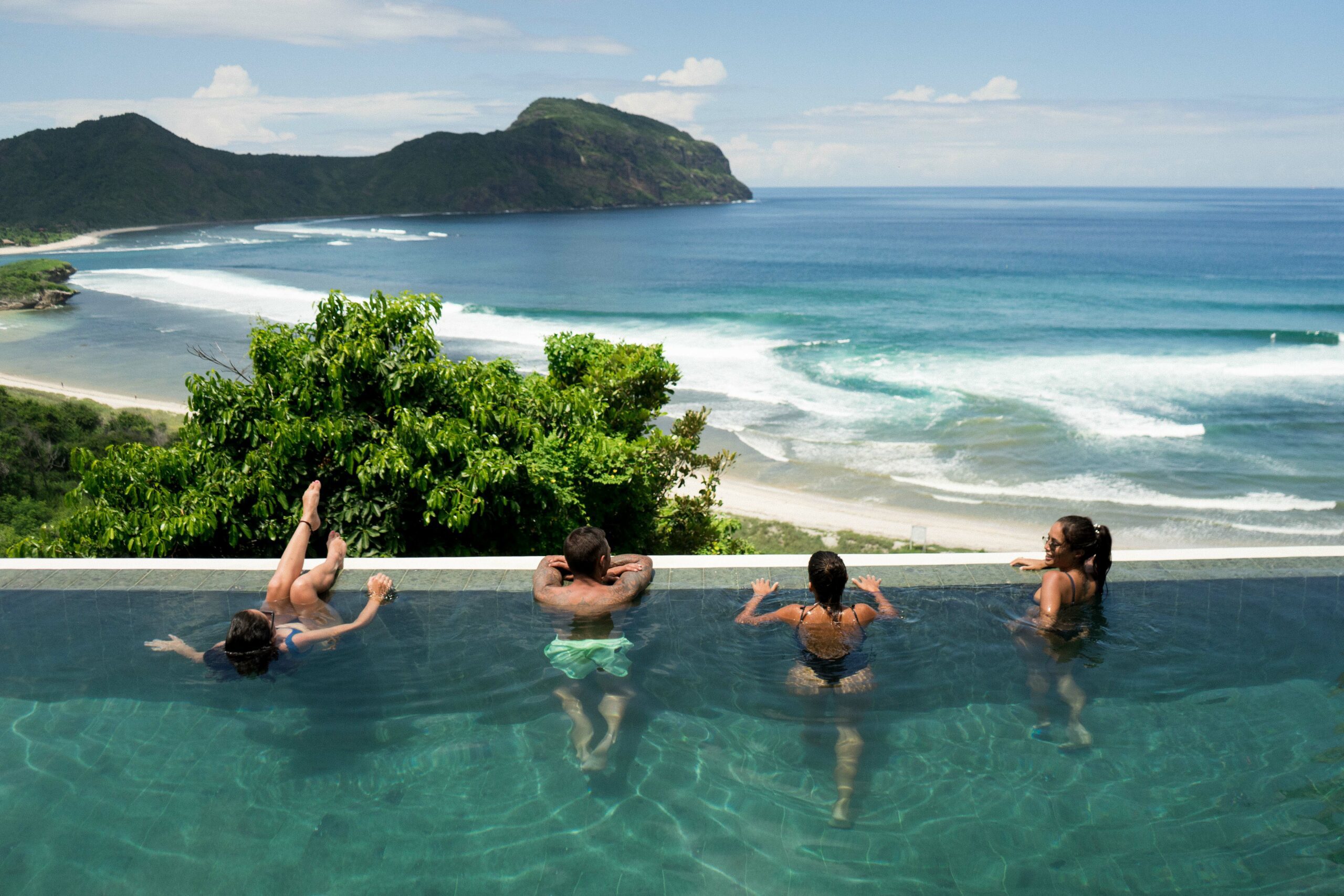 For larger groups or families, Kini's villa stands proudly atop a hill, a mere two-minute walk from the main resort. It offers breathtaking 180-degree views of the bay and mountains, alongside luxurious amenities like an infinity lap pool, a full kitchen, and multiple dining and lounging areas.