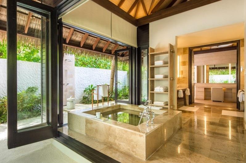 These stunning villas are located over water and have beautiful views. They feature a separate living area with large doors that open up to the terrace where there is an infinity pool and access to the sea. The bathroom has a separate dressing area and the spacious bathroom has a sunken bath and outdoor shower (120sqm/1292sqf)