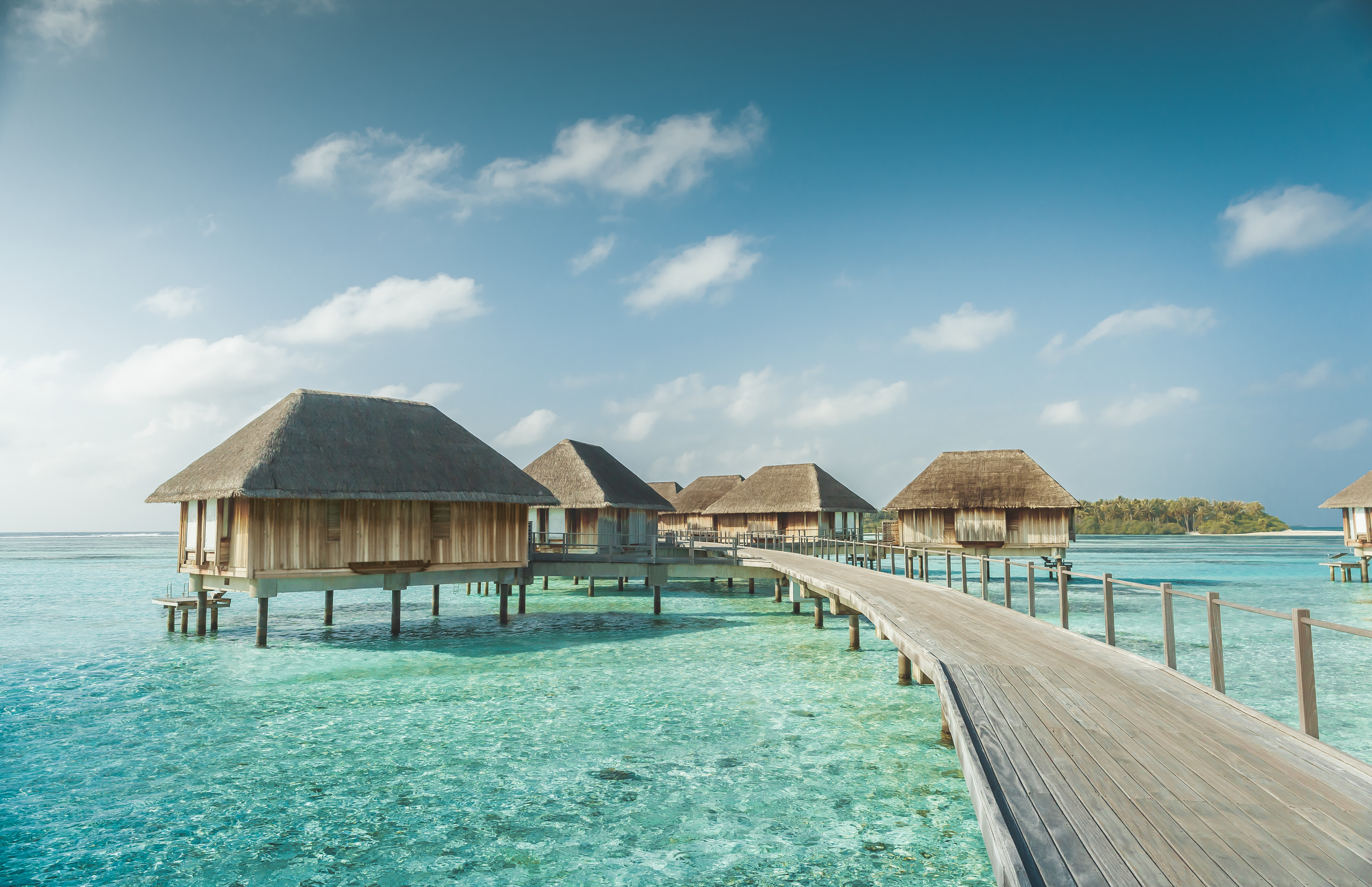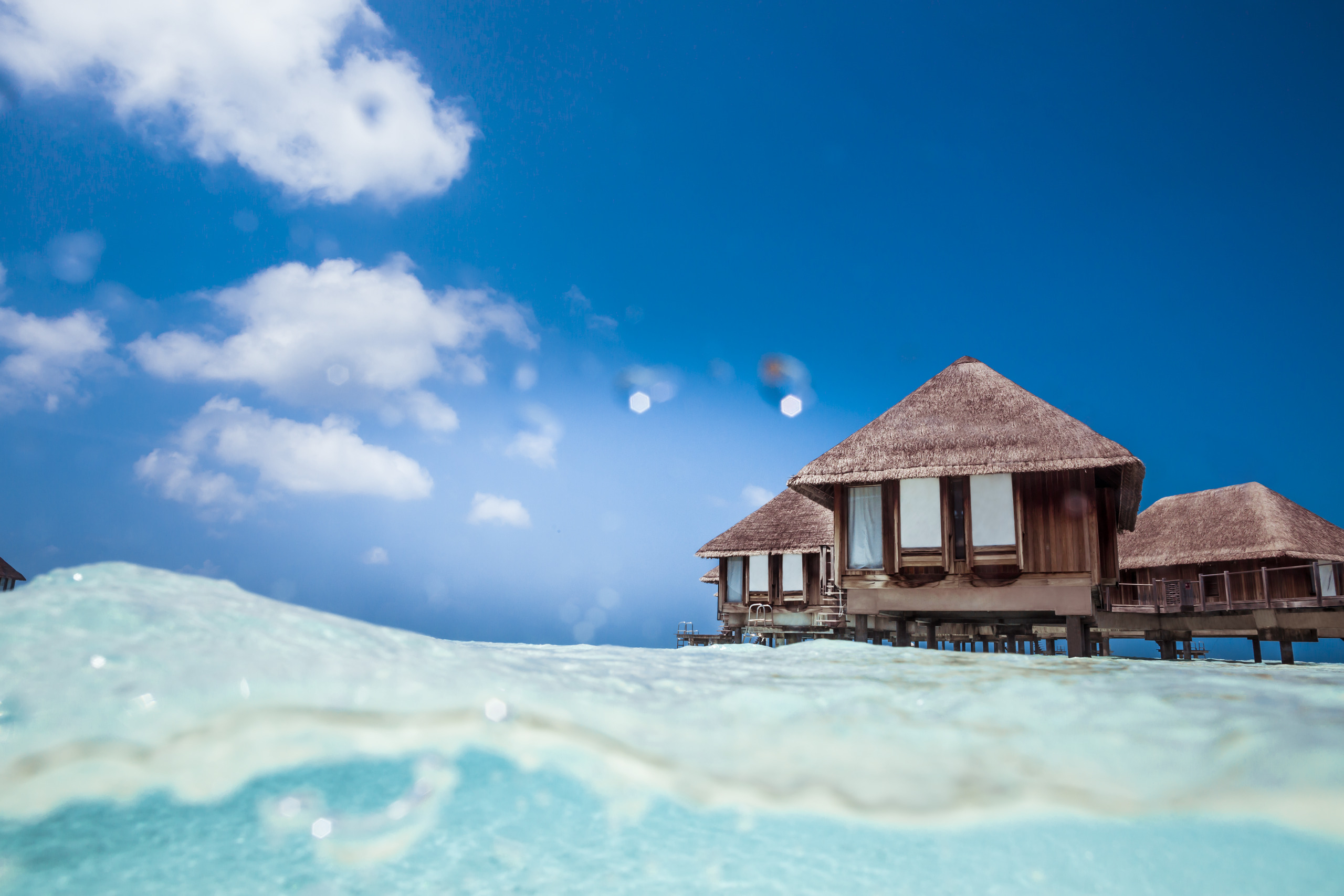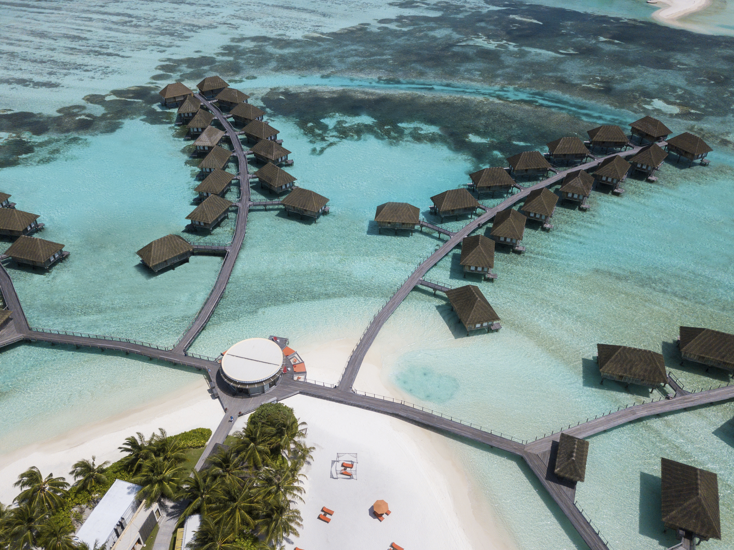 For a unique and unforgettable stay, a spacious and elegant Overwater Suite with a magnificent view over the lagoon. You can dive straight into the water from your private, furnished terrace. Access to the Suites via pontoons that form a palm tree shape when seen from the sky. Lie back in luxury with a fabulous view of the lagoon from your bathtub! All packages include: return airport to resort transfers, all meals daily, open bar (top shelf spirits and Champagnes not included), snacks served at specified times during the day & night, resort activities. Price based on 2 guests.